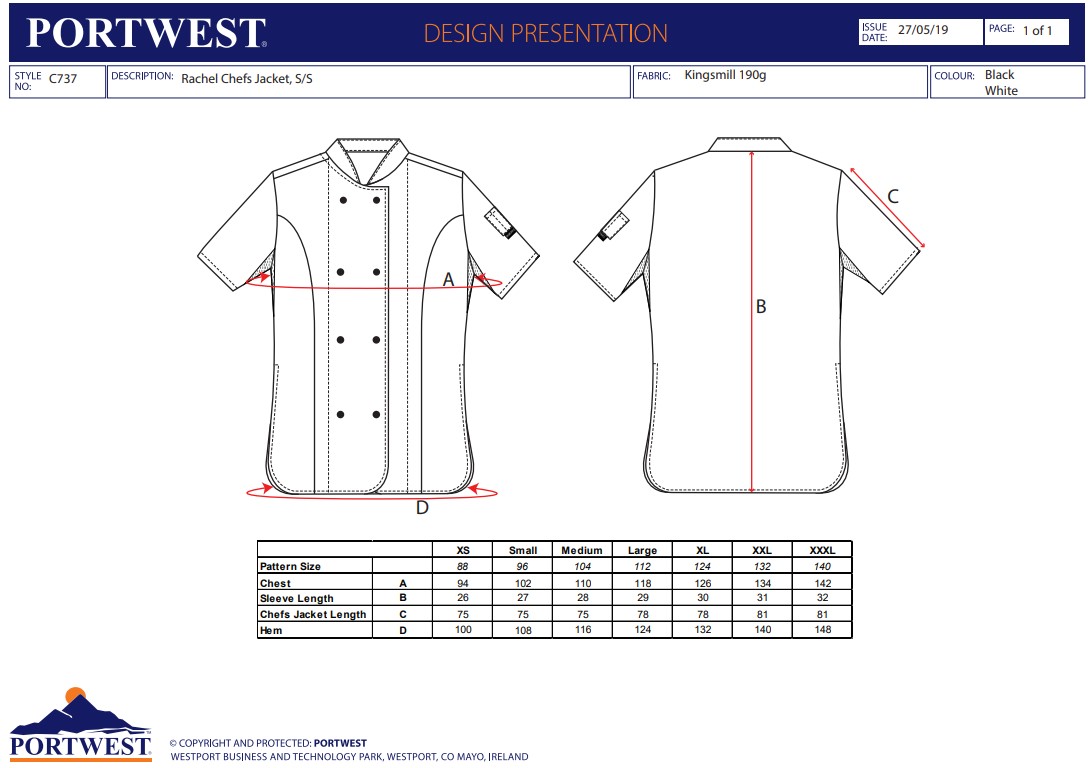 Portwest C737 Rachel Women's Chefs Jacket S/S C737